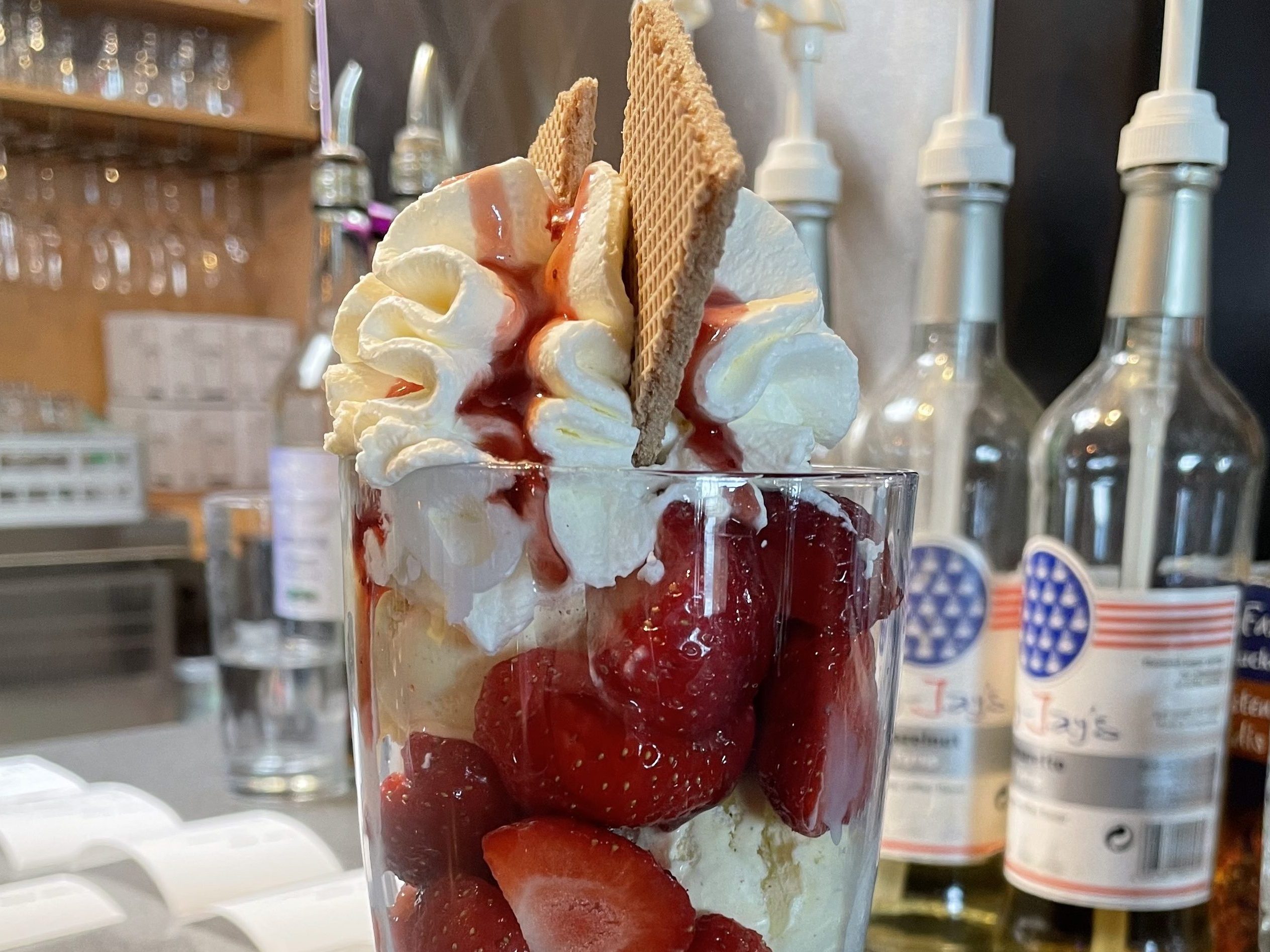 Schauen Sie sich gerne bei uns an der Theke die frische Kuchenauswahl an und bestellen Sie bequem am Tisch.
